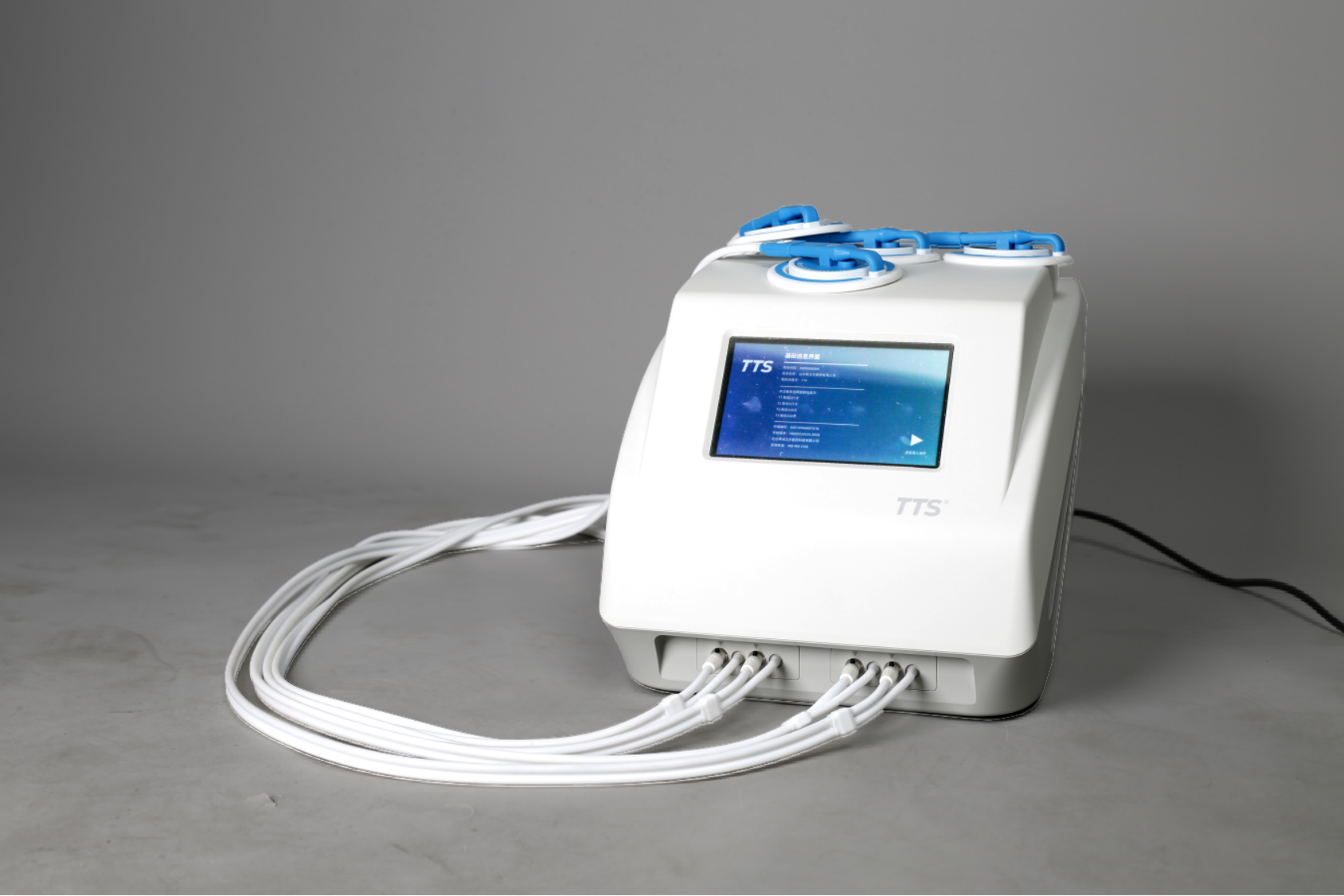 取出4套蒸敷盘插入设备前端接口并接通气管,接通电源,打开治疗仪后面的电源开关,此时,治疗仪控制面板显示时间为 45min( 可依据不同皮肤体质和不同环境条件,触摸每个通道对应屏幕上的设置按钮调整档位、级别等参数。)